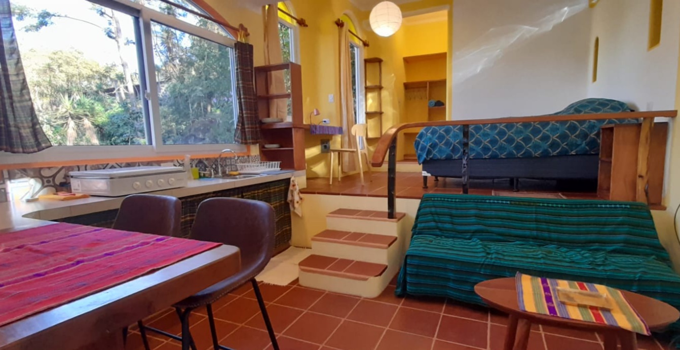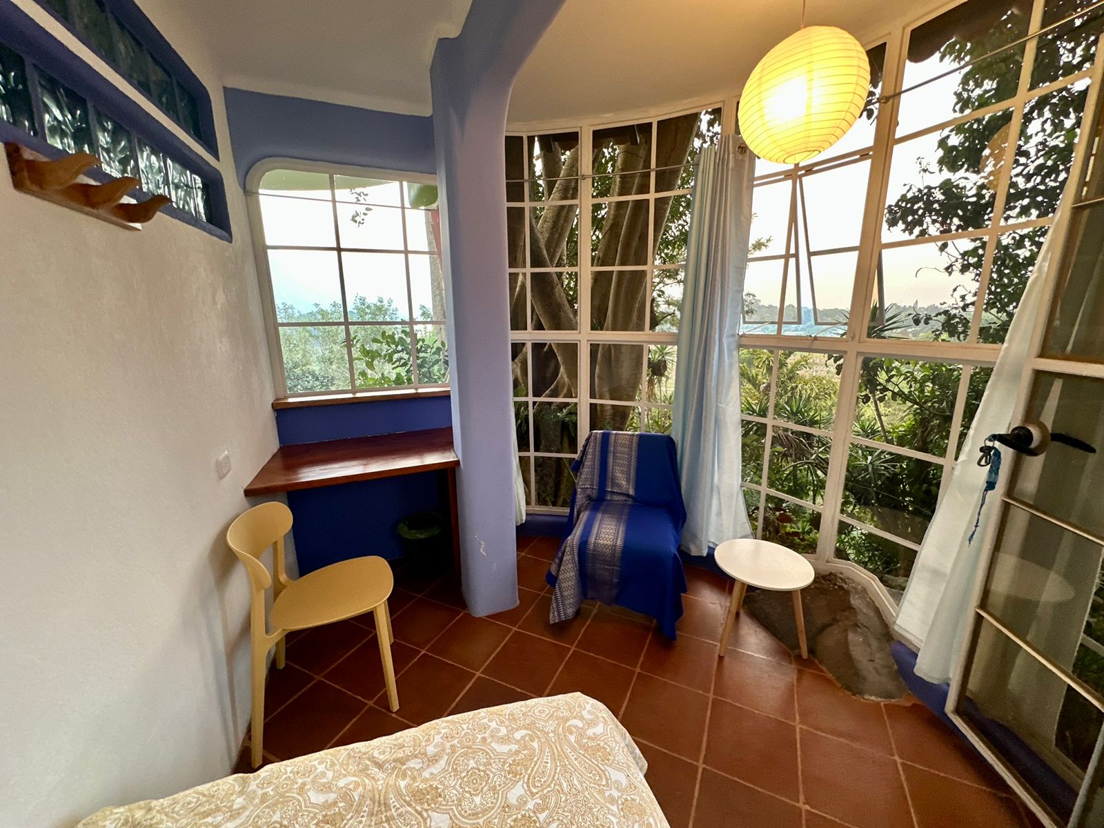 Cette petite chambre très économique, avec sa fenêtre semi‑circulaire, donne l’impression de faire partie du paysage naturel qui l’entoure.Idéale pour l’étude ou une retraite personnelle, elle donne accès à une kitchenette, à des salles de bain et à une pergola communes.